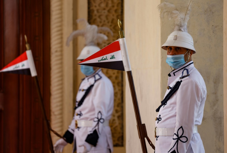 Iraqi honour guard hold national flags ahead of a regional summit in the capital Baghdad © AFP / Ludovic MARIN