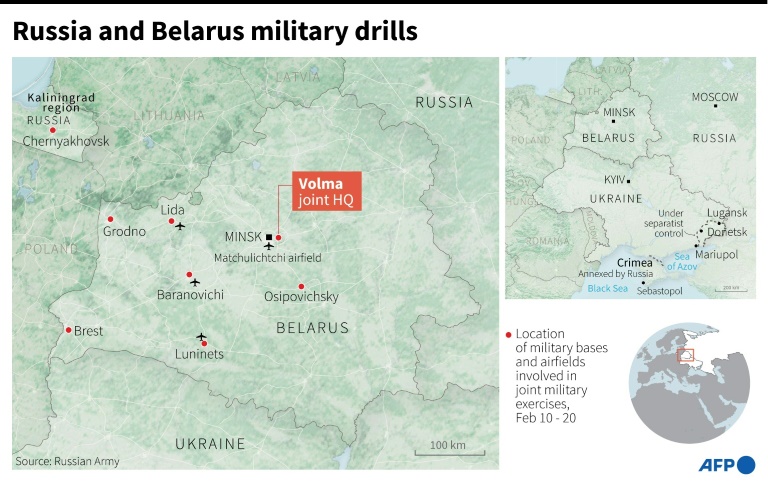 Map of Belarus locating military bases and airfields involved in the joint military exercises with Russia, Feb 10-20. © AFP / Jonathan WALTER