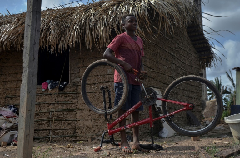 Gabriel Silva plays with a bicycle outside his house © AFP / JOAO PAULO GUIMARAES