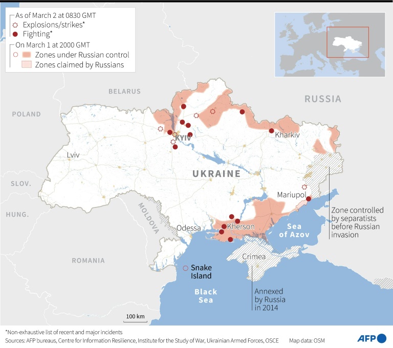 Map of Ukraine locating areas where explosions, strikes and fighting have been reported and under Russian control, as of March 2, 0830 GMT. © AFP / Kenan AUGEARD