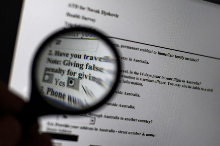 A magnifying glass highlights a released copy of Serbian tennis champion Novak Djokovic’s health survey submitted during his Australian visa application process for his arrival in Melbourne ahead of the Australian Open tennis tournament © AFP / Richard A. Brooks