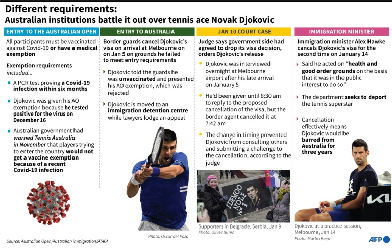 Graphic on developments between Novak Djokovic and Australian authorities since he arrived in Melbourne, updated January 14 with Djokovic’s second visa cancellation © AFP / John SAEKI