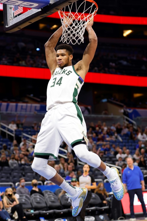 Milwaukee’s Giannis Antetokounmpo celebrates a dunk in the Bucks’ NBA win over the Orlando Magic © GETTY IMAGES NORTH AMERICA/AFP / Michael Reaves