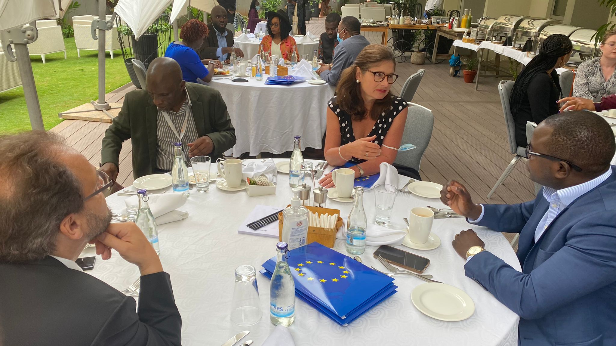 The European Union Ambassador to Kenya Henriette Geiger chats with Capital FM’s Editorial Director Bernard Momanyi during a media breakfast at Radisson Blu hotel in Nairobi on November 2, 2021 during the launch of the 2021 Erasmus Mundus Master’s Scholarships.