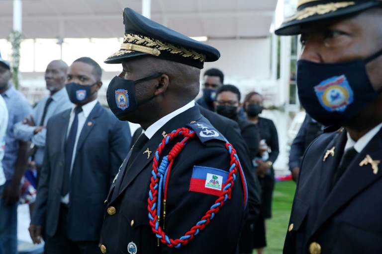 Haiti’s national police chief Leon Charles (C) — seen here at the funeral of Jovenel Moise — was heckled by locals in Cap-Haitien who believe his force did not do enough to protect Moise © AFP / Valerie Baeriswyl