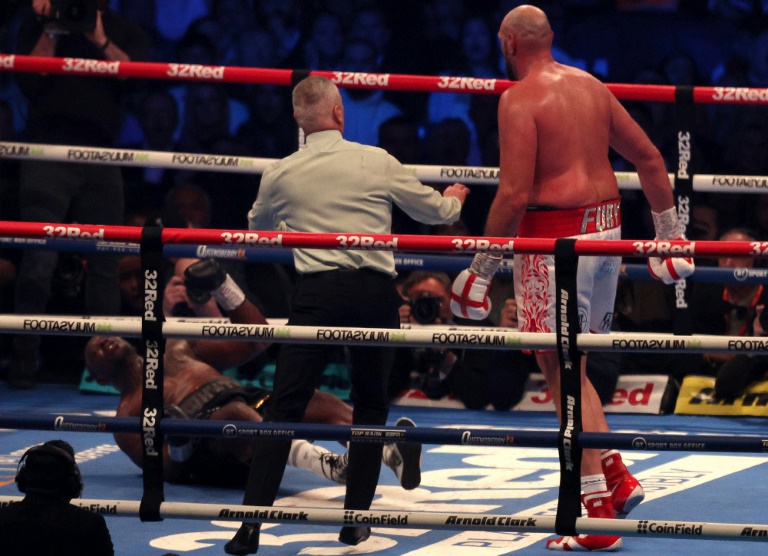 Tyson Fury stopped British rival Dillian Whyte in the sixth round to retain his WBC heavyweight crown at a packed Wembley on Saturday. In his first fight on UK soil in four years, Fury was treated to a hero’s welcome by a 94,000-capacity crowd and largely dictated the tempo before ending proceedings in devastating fashion. Britain’s Tyson Fury (R) knocks out Britain’s Dillian Whyte in the sixth round to win their WBC heavyweight title fight at Wembley Stadium in west London, on April 23, 2022. © AFP / Adrian DENNIS
