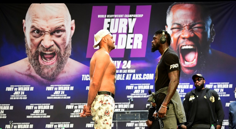 England’s Tyson Fury, left, and American Deontay Wilder face off at a June news conference to promote their heavyweight title showdown, which has been moved to October 9 after Fury contracted Covid-19 © AFP/File / Frederic J. BROWN