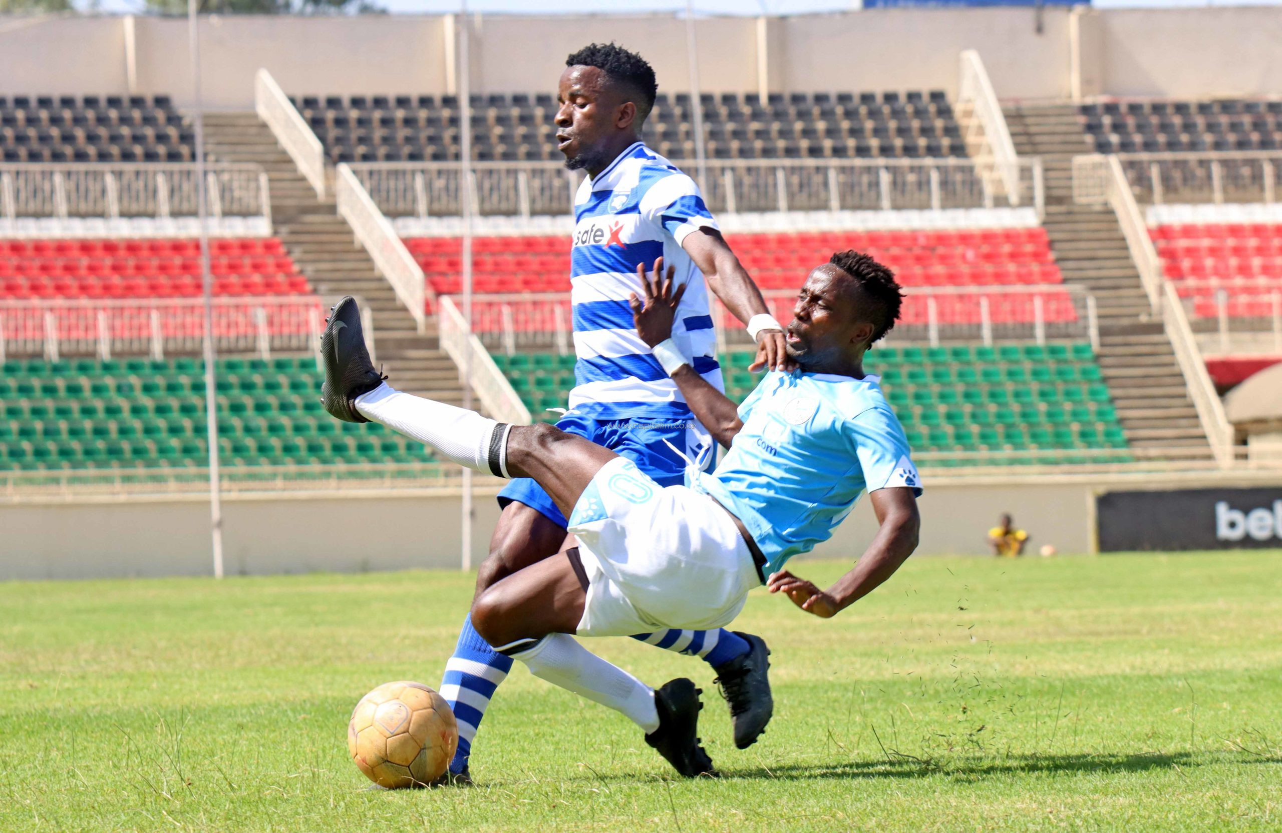 Sofapaka defender Titus Achesa clears the ball from AFC Leopards’ Maxwell Otieno. PHOTO/Timothy Olobulu