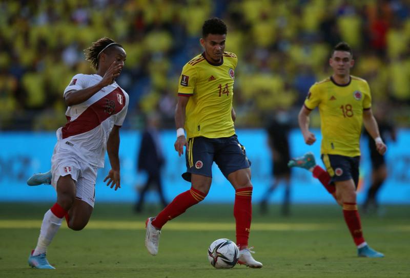 January 28, 2022 Colombia’s Luis Diaz in action with Peru’s Andre Carrillo REUTERS