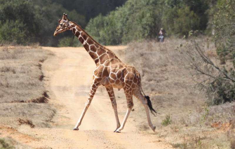 A giraffe crossing rallying way at Loldaiga Ranch in Laikipia County, Feb 11, 2022. [Jonah Onyango, Standard]
