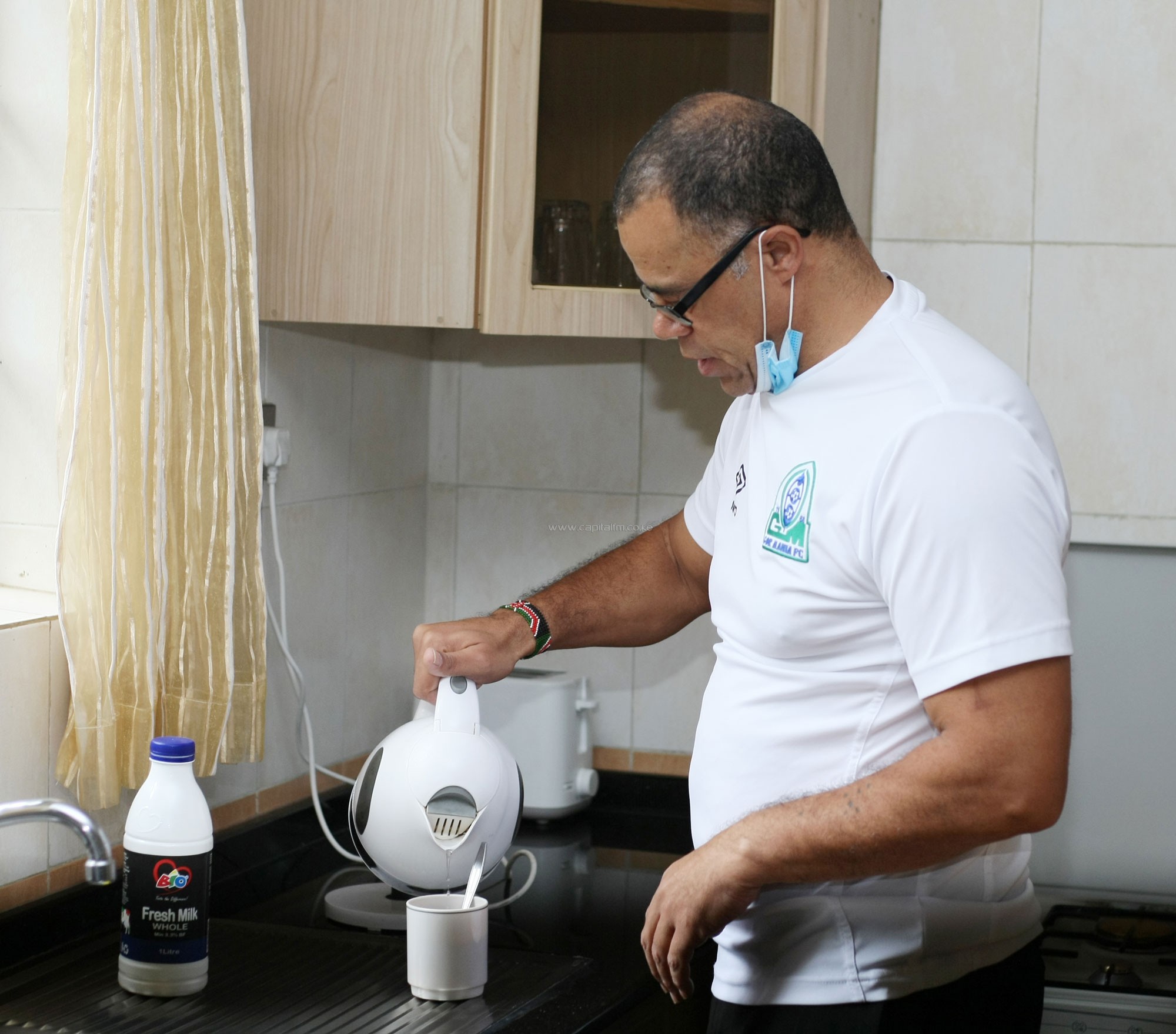 Gor Mahia head coach Steve Polack prepares a cup of coffee at his residence in Nairobi. Photo/RAYMOND MAKHAYA