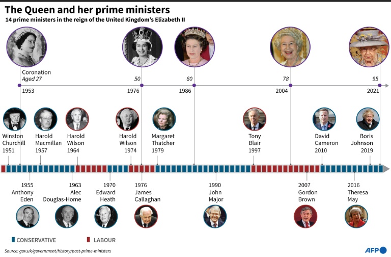 Timeline showing UK prime ministers who have come and gone since the Queen’s coronation in 1953. © AFP / John SAEKI
