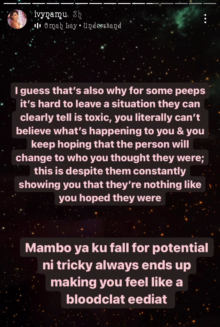 “Kila mse amekapitia in this life. I’m just thinking out loud; plus I wish more people talked about it when I was going through it. Maybe I wouldn’t have wasted years of my life on big nonsense” she said.