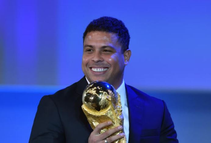 Former Brazilian footballer Ronaldo holds the World Cup trophy during the opening ceremony of the FIFA Congress in Sao Paulo on June 10, 2014, two days before the opening match of the 2014 FIFA World Cup in Brazil. AFP PHOTO / NELSON ALMEIDA