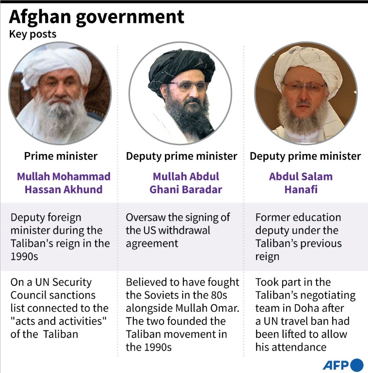 Graphic on the new leadership of Afghanistan, showing the Prime Minsiter and his two deputies. © AFP / John SAEKI
