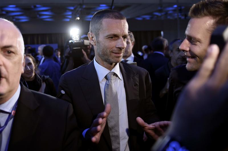 Aleksander Ceferin (C) is congratulated by UEFA representatives during the 12th Extraordinary UEFA congress in Lagonissi, some 40 kilometers south of Athens, on September 14, 2016 [COURTESY]