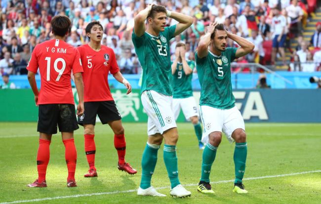 Football – World Cup – Group F – South Korea vs Germany – Kazan Arena, Kazan, Russia – June 27, 2018. Germany’s Mario Gomez and Mats Hummels react after a missed chance. [REUTERS/Michael Dalder]