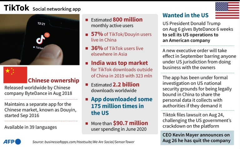 Factfile on Chinese video-sharing social networking app TikTok, and US moves against the owner of the company. © AFP / Janis LATVELS