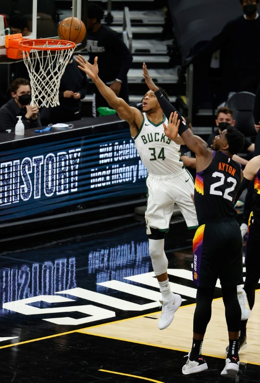 Milwaukee’s Giannis Antetokounmpo shoots a layup against Phoenix, but his status for Tuesday’s NBA Finals opener against the Suns is questionable due to a left knee injury © GETTY IMAGES NORTH AMERICA/AFP/File / Christian Petersen