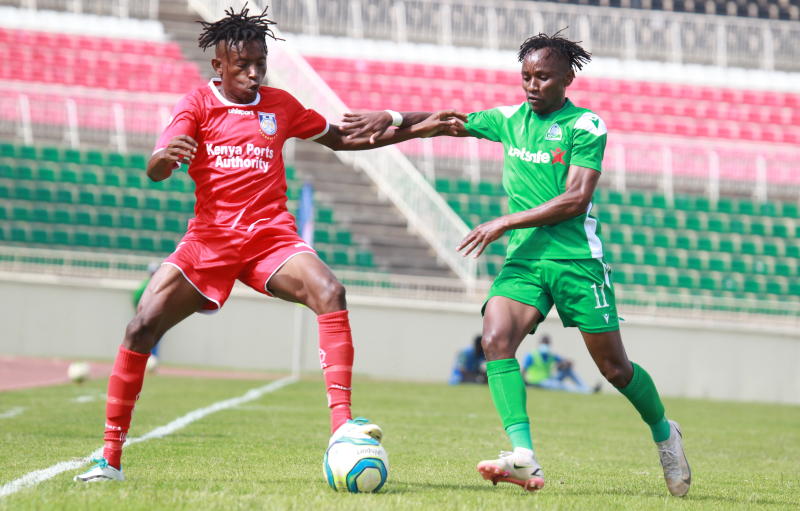 Gor Mahia’s John Macharia and Siraj Mohammed (left) of Bandari during FKF Premier League at The Nyayo national stadium on Sunday, December 12, 2021. [Jonah Onyango Standard]