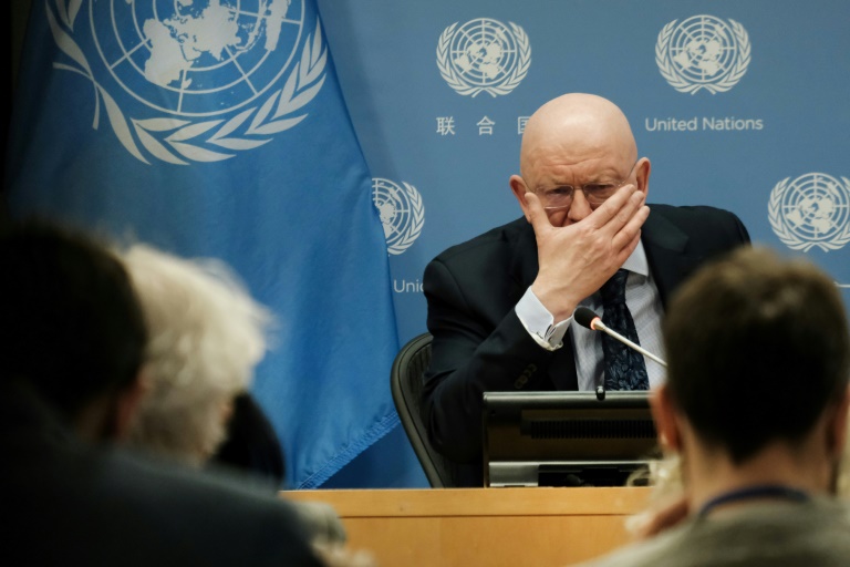 Russia’s ambassador to the UN, Vassily Nebenzia, speaks to the media about charges of a massacre in the Ukrainian town of Bucha at United Nations headquarters on April 04, 2022 in New York City. © GETTY IMAGES NORTH AMERICA/AFP / SPENCER PLATT