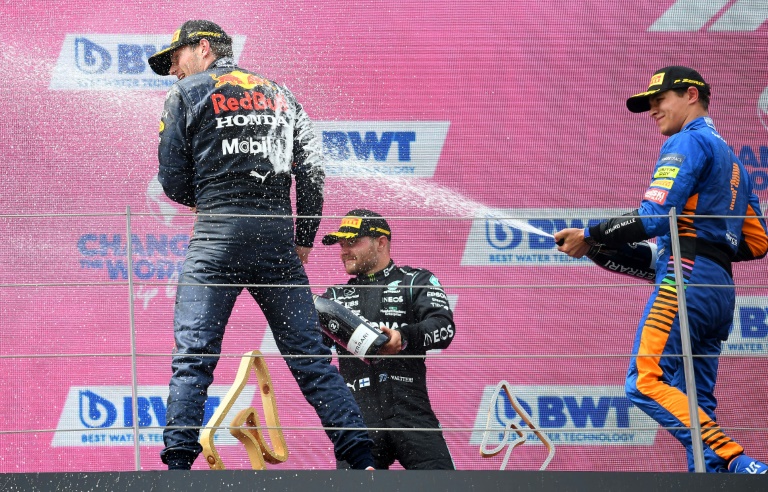 Norris (right) overcomes time penalty to make podium © AFP / JOE KLAMAR