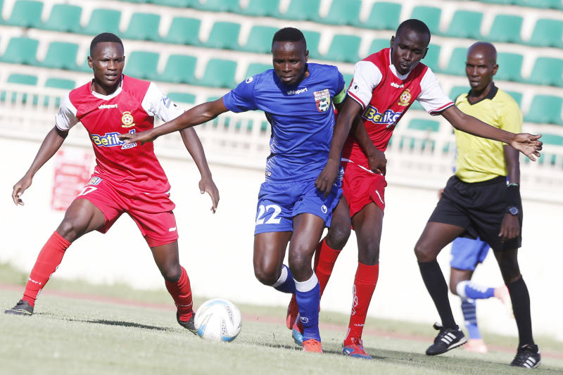 Alvin Mangenyi (L) and David Oluoch (R) of Kenya Police FC tackle Lucas Weitere of Vihiga Bullets FC during their FKF Premier League match at the Nyayo national stadium in Nairobi on January 04, 2022. [Stafford Ondego, Standard]