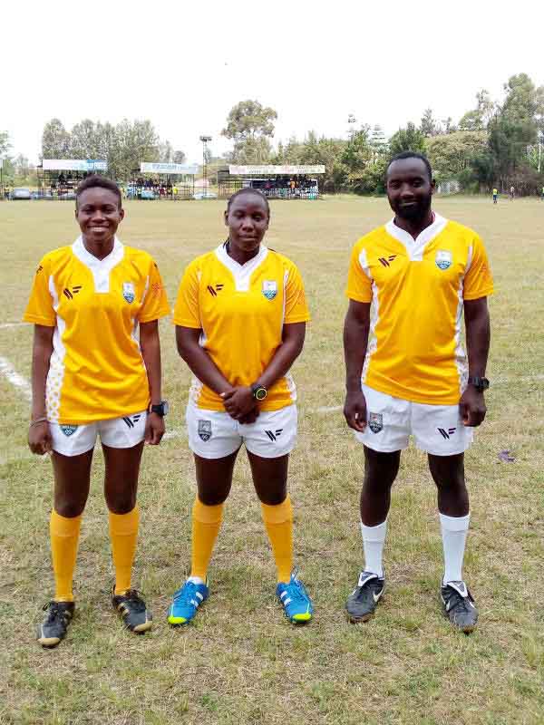 Referee Noreen Liyosi (left) with her colleagues Beril Akinyi and Brian Kipkoech after a recent Kenya Cup match in Nakuru [Kipsang Joseph, Standard]